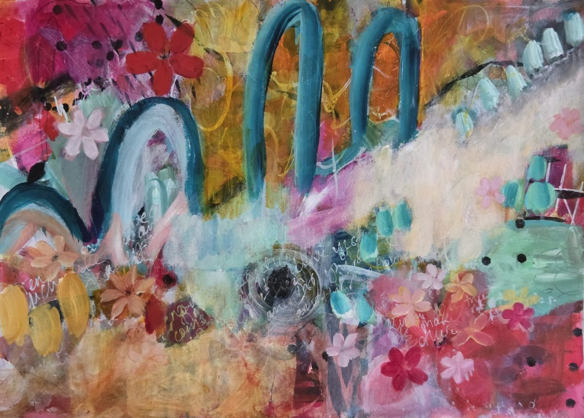 She paints intuitively, letting works evolve by building layers, obscured, sanded back, reworked, and sometimes left alone just long enough to reveal their story. Words often appear in her paintings too, partly hidden, scratched through, or buried beneath the surface.